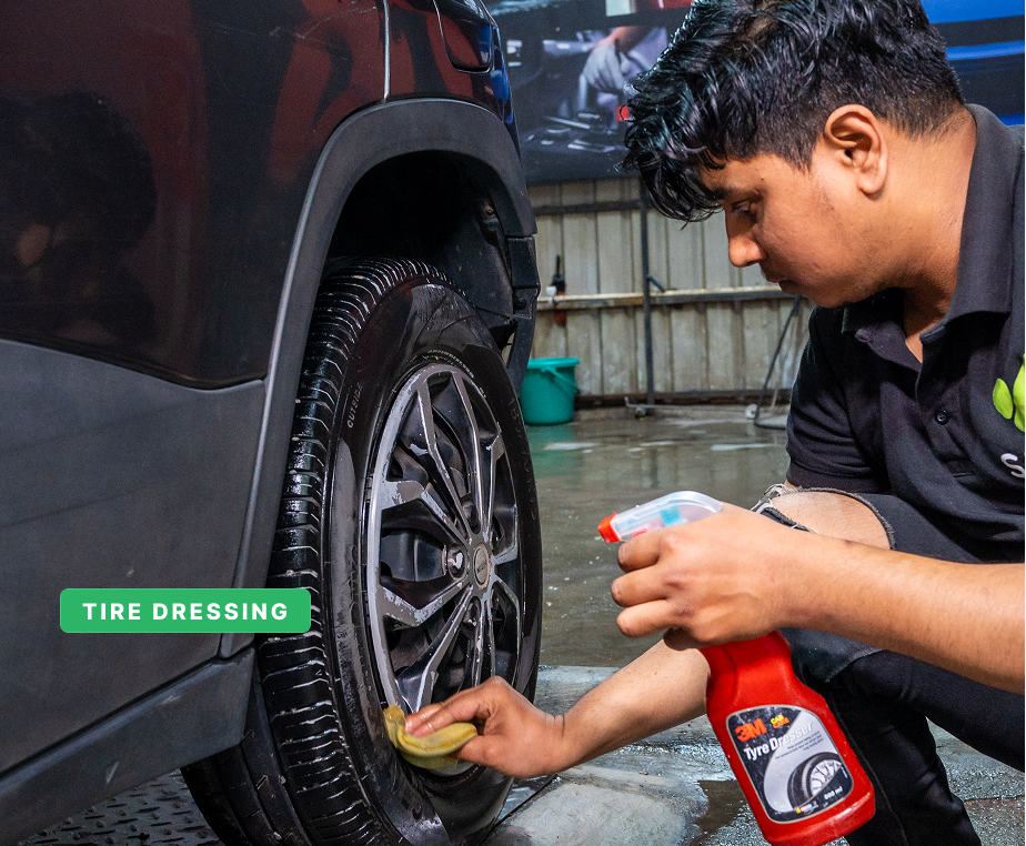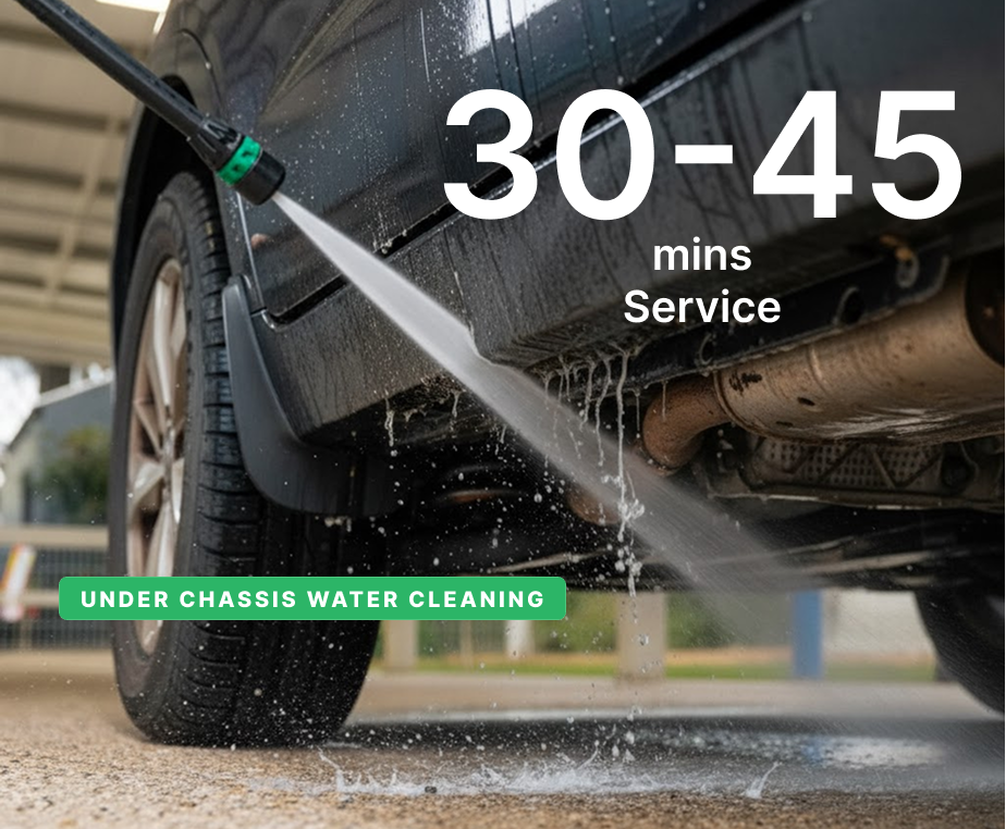 The service covers a full exterior pressure wash, side-beading cleaning, tyre dressing, and under-chassis rinse.